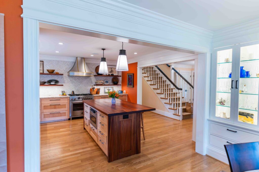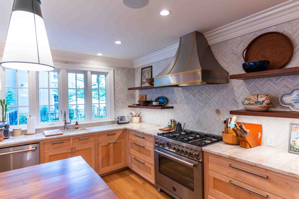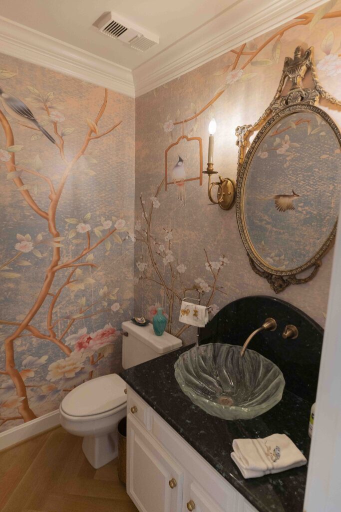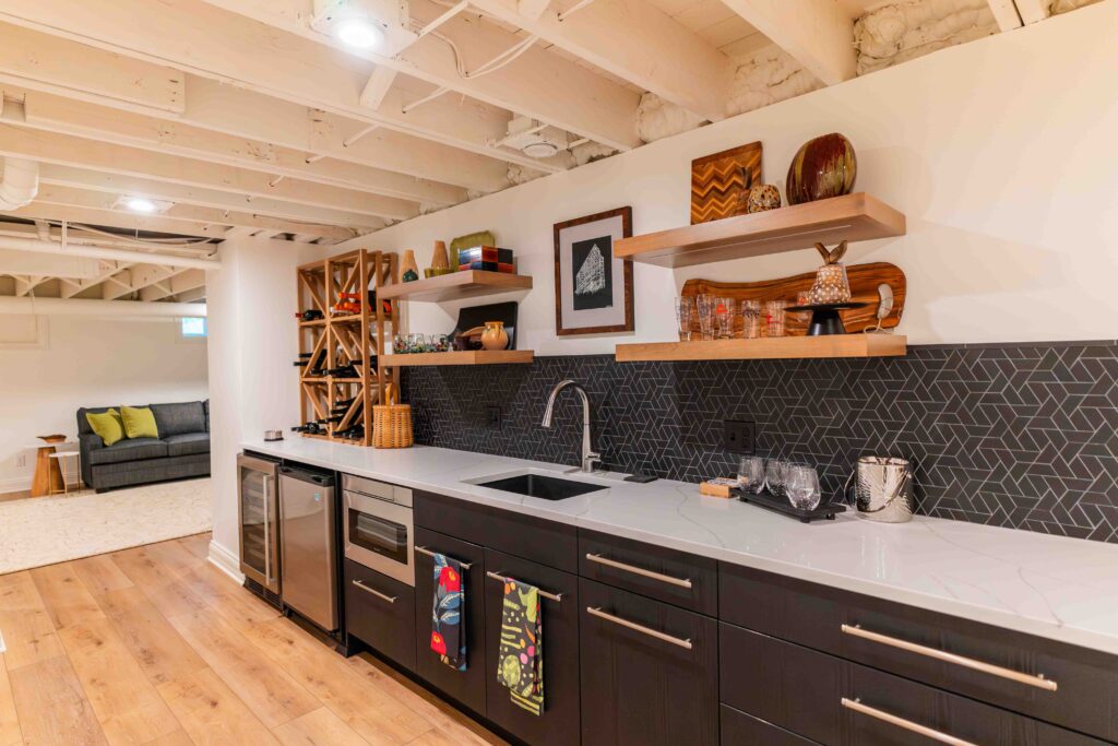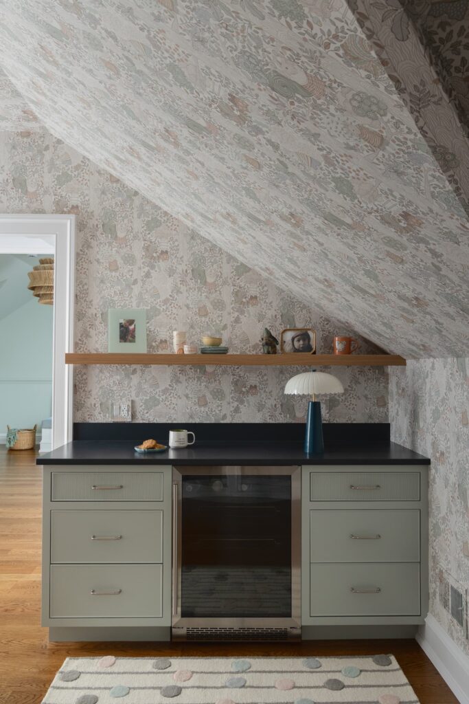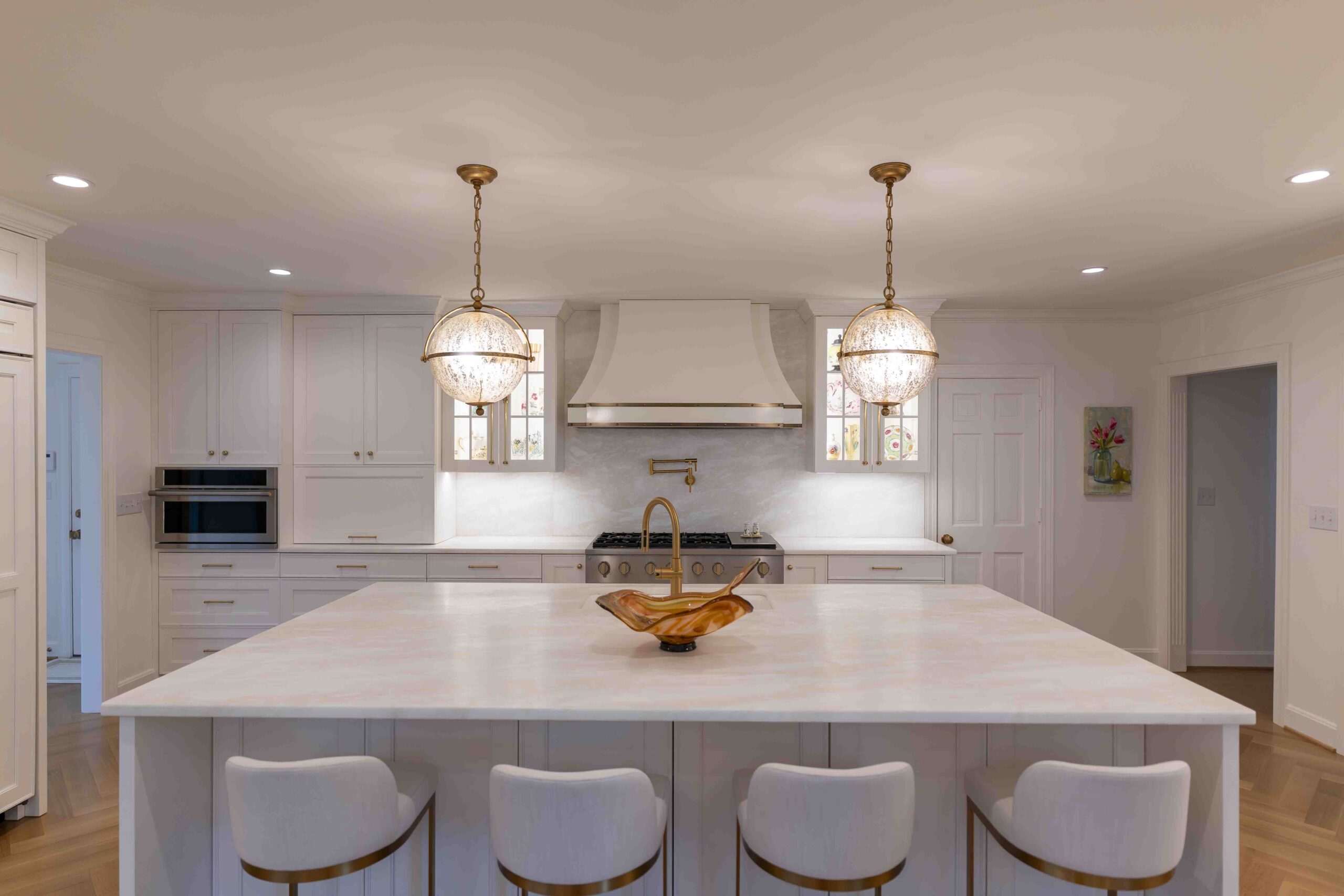 This extensive renovation blends luxury, function, and craftsmanship at every turn. The home features a state-of-the-art kitchen with a hidden walk-in pantry, a dedicated golf simulator room, an exercise room, and a custom elevator for easy access across all levels. The renovated basement was designed with entertaining in mind, complete with a home bar, guest suite, and a vault and wine room that add both sophistication and style. (Photography by Rock Paper Hammer)(Custom cabinetry by Andrew Hyslop)